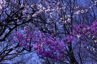 | 3.梅の花とミツバツツジのコラボレーション | 4.園内には約400本の梅が7〜8分咲きです |