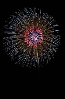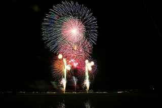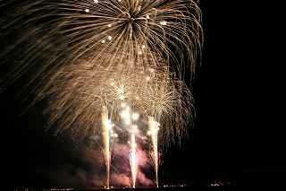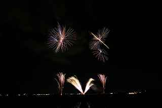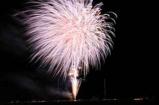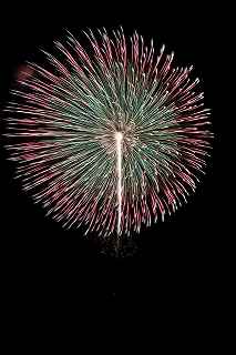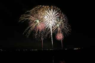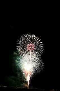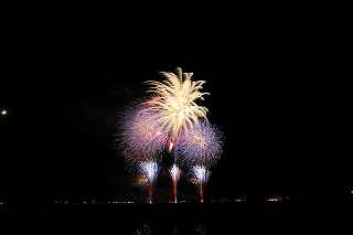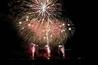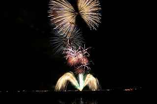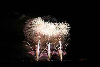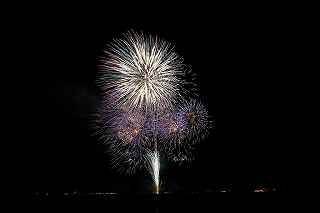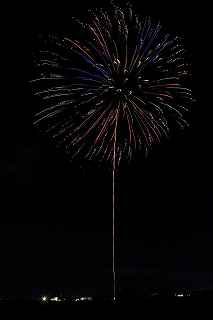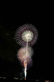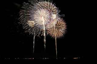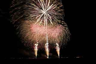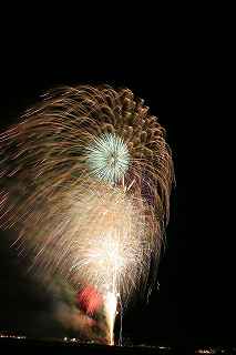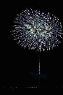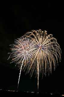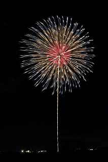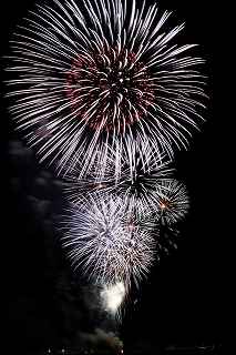 | 玉村町をご存知の方はそうは多くはいないのでは?伊勢崎市に近く、利根川を渡れば埼玉県本庄市。 人口37000人余りの町。 ここは例年、開催が土曜日であることが多く、行くことが出来ずにいましたが、なぜか今年は「海の日」の祭日にぶつけてくれて、初参観を果たしました。 担当煙火店は菊屋小幡花火店さん。 お世辞にも決して大きな町ではないのに、メジャーな花火店さんが尺13発、豪華なスターマインを5回以上打ち上げてくださるのです。 観覧場所は殆ど遮る物がない緑の水田地帯。 300メートルの高さを誇る尺玉を揚げるのに、こんなに近くていいの?と思える、首が真上を向き痛くなりそうな場所。 目茶苦茶沢山の人が来るわけでもなく、保安距離ぎりぎりの舗装路に観覧の人、水田を隔てて100メートルほど後ろにカメラマンの三脚のカベ。 上手く住み分けが出来ていてこんないい大会はない。 (あまり大きな声では言えないのですが、観覧の人たちとカメラマンとは相容れない部分が少なくない。 彼らは三脚が邪魔だろうし、我々は、どうしてこんないい花火の時に立ち歩いて前を横切るかなァ。 おかげで没になったこと何回かあります。) もっとも、はじめて行く花火大会で満足の行く撮影は私の能力では無理。 幸いにも朝8時に場所取りをしてもらった友人から、沢山の情報は得たものの、百聞は一見にしかず,やはり自分でファインダーを覗き失敗してみないとダメ! W氏曰く、「今日は今までにない北よりの風なので、一応2箇所おさえましたが、どちらが良いか場所を見てください。」と言われ確認するも、東に回っても西に回っても、横風であることには変わりはない。 途中で出会ったセミプロと言ってもいいA氏から「消防署の方にも三脚並んでました。」と言われ、ロケハンしたものの、建設中のバイパスの法面や、立ち入り禁止のオレンジ色のネットが目障りで、追い風以外メリットなし。 結局、定位置に決定。 よって全ての花火が右から左へと流れています。 更に画郭オーバーとかカメラが斜めになったものなど、色々ミスしました。 来年、もし日にちが合えば、そして東よりの風が吹けば、今年の失敗とノウハウを生かしたいと思います。 撮影日:2013−7−15 第25回たまむら花火大会にて |