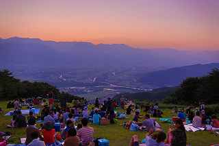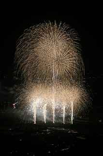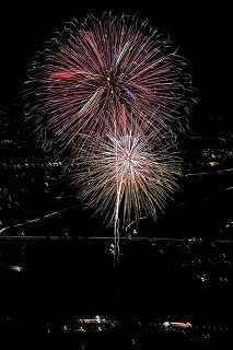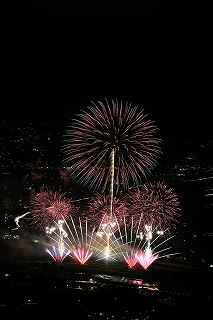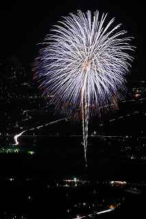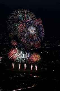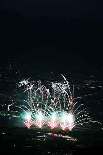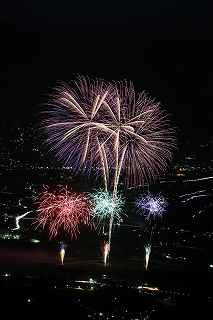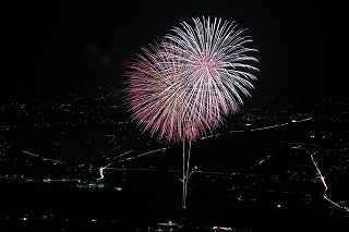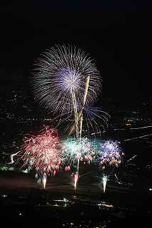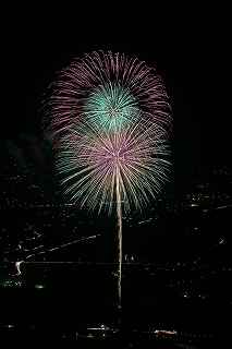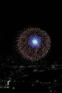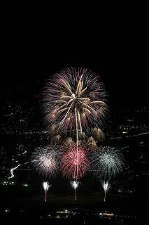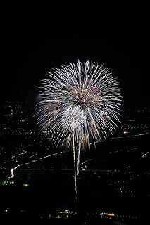 | 3度目の観覧となる。 あまり有名な花火大会ではありませんが、小規模ゆえに良さも有ります。 2度目に訪れた時、岐阜のY氏から「長峰山山頂からの撮影も良いですよ。」と教えられ、彼の案内で頂上までのヘアピンカーブを登って行った。 山頂は開けていて、市内が一望できる素晴しい眺め。 2年前の案内で、街の灯りと花火とのマッチングがとてもステキですっかり気に入り、今回も来てしまいました。 緩やかな傾斜の付いた芝生は、シートを引けば座って楽に見ることが出来(私にはどうでも良いことですが)、ムード満点で、最近お付き合いが始まったばかりのお二人には、最高の場所といえます。 (さらに余計なお節介ですが、花火終了後は、横になって星空を眺めるのもいいです。 学のある男性なら、星座物語でも語ればもう言うことなし。その後はご自由に・・・!) 小さなお子様をお連れの場合、打ち上げ場所からは、2キロほど離れているので、花火の迫力を全く感じません。 車でないと麓から歩くのはちょっと無理。 などの制約はあります。 よって飽きた時は帰るしかありません。 実は、飽きるというのには訳が有りまして、プログラムがそうなっているのか、下で仕掛け花火か何かやっていて、上では見えないのか判りませんが、間が空きすぎていて拍子抜けしてしまうのです。 同行した伊勢原のK氏は「これなら、芝生に寝転んででも撮影出来ちゃいますね。」と退屈そうでした。 HPには総打ち上げ数一万発と有り、期待していたのですが、その半分ぐらいの印象でした。 (元々打ち上げ総数は、あまり当てにはならない事は承知していますが、3000発でも凄く満足する大会もあるし、後から後から完成度の低い玉をごちゃごちゃに混ぜて、総数だけは凄いのもありますから。) でも今年の安曇野はそのどちらでもなく、残念。 初めて来た時は、テーマが確か「春夏秋冬」だったと記憶していますが、玉数は少なかったものの、季節の色が花火に表現されていて大変説得力のあるものでした。 小さな大会に光るものを見つけたようで、又足を運びたいと思ったものです。 終了後はK氏と別れ、翌日の諏訪湖花火の会場へと向かいました。 撮影日:2013−8−14 安曇野 19時〜21時 にて |