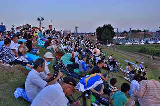 | 1.法面カメラマン席方向を臨む | 2.プロローグ花火5号玉70発すでに強風の影響大 |