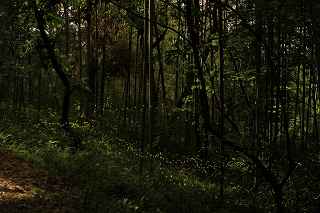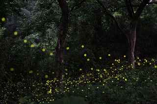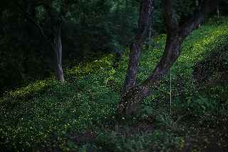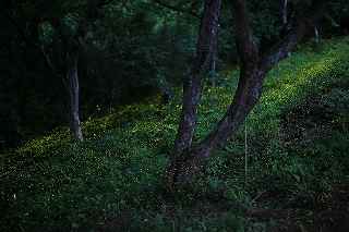 | 600頭、それは劇的増加であった。 前々日まで、地主さんからのお電話では、その数は悲惨だった。 1頭、4頭、30頭、・・・数字があまりにもお気の毒なので、「沢山出てからでいいですよ。」と申し上げた。 倉皇しているうちに、師匠を、お連れする15日が来てしまった。 途中、新規開拓地、あきる野の源氏蛍探索もあるので、あまりやりたくない事だったがぶっつけで秩父まで走ることになった。 天候は晴れ、秩父入りして、稲光が激しく光っていたものの、にわか雨程度で済んだ。 いやむしろ曇りのままであって欲しかったが、やがて満月を少し過ぎた月が、やたらと明るく上って来た。 撮影には、かなりの影響があり、休耕田や栗畑など、上に木がないところの撮影は厳しかった。 もっとも個人的には、ヒメ蛍の撮影よりも、地主さんの奥様に頼まれたお届けものがあったし、日ごろの、ご無礼をお詫びしなくてはならなかったのと、自分より師匠に満足の行く写真を撮ってもらえれば(師匠は蛍、特にここのヒメ蛍の撮影の為、35ミリ短焦点を新調されたので)、この日の自分の役目は果たしたことになると考えていた。 例年より、1週間から10日遅い「光の絨毯」に、一番安心したのは、F氏だったかもしれない。 いつも23時ごろ、ご自宅を出発し、行きに数え、帰り道再びカチャカチャを押し、平均を取る。 この日カウンターにライトを当て数字を見ると、にっこり笑った。 その表情は暗闇ではっきりはしないが、充分察することが出来た。 2月の大雪で秩父は大変な被害を出した。 昨年、私が撮ったヒメボタルの写真には、しっかり写っていた、ビニールハウスが今年はない。 家の前の大きな通りはすぐに除雪してくれたが、生活道路は暫く不通だったそうだ。 分厚い雪をかっぶたヒメ蛍の幼虫は、生きながらえられるのか? そしてその後暫く少雨だったと言う。 果たして・・・。 「いつもなら6月第1週にピークが来てもおかしくないから、今年はもう出ないのでは?」地元の朝日新聞のプロカメラマンY氏も一時そう思ったと、この日の蛍の乱舞を見ながら語ってくれた。 今こうして、沢山の光の玉を目の当たりにすると、、ただ彼らの生命力に敬意を表し、感謝するしかない。 去年より遥かに多いカメラマンが駆けつけ、最奥部など撮影場所が確保出来ないほどの有名地になって、少し心配だが、この素晴しい生息地をずっと残したいと思うのは、地元の方、カメラマン問わず全員の気持ちであることは間違いない。 結局、昨年とあまり変わり映えしない「竹林」と、定番スポットである、「どん詰まり」の撮影に終わってしまった。 ただ、昨年と異なるのは、休耕田、草原、その他至る所で飛んでいたと言うこと。 自分に、これらの場所での撮影技量がないため、F1,4で30秒も開けておくと、昼間の写真になって、蛍と葉の緑が同色化してしまうのです。 まだまだ未熟です。 午前2時半ごろ群馬からいらしたkazuさんが帰り、入れ替わりに若い背のあまり高くないカメラマンが竹薮に近づいてきた。 今頃?と思ったが、話をするのも疲れていたので無視していたのだが、「コンバンワ」と挨拶をしてくるので仕方なく応じた。 その話が愉快だった。 「ここが、だんだん知れ渡ってきたので、自分で新規開拓した場所がある。」とのこと。 オーそれは耳寄りな話だこと。 そこで初めて彼の方を振り返り、顔を見て話を聞くことにした。 「このくらいは飛んでますよ。」 「ここからそんなに遠くないですよ。」 「新規開拓なので、何人かしか知らないと思います。」 「昨日は友人と二人で行きましたが、今日は一人で行きました。」 ここまでは良かった。 が、実は、この場所への到着が今頃になった理由は、二晩ともイノシシが傍まで来て、怖くて固まっていて、いなくなるまで動けなかった。という落ちが付いていた。 「初め、カサコソ音がして、『誰か来たのだろう。』位にしか思っていなかったが、どうも鼻息が荒いんで、不思議に思って振り返ったら・・・。 懐中電灯を当てても一歩も引かず、じっと相手もこっちを睨んでいた。 少し後ずさりして、イノシシが立ち去るのを待つだけでした。 そんな訳で・・・今頃来たわけです。」 私、当初是非とも場所を聞きだそうと思っていたが、この話をされたとたん、聞きたくなくなった次第。 そういえばF氏も、「庭にあった山百合の根がイノシシにやられて、全部なくなった。」と言われていた。 この辺でも、遭遇の可能性は全くないわけではなさそうだ。 その裏づけになるのか判りませんが、畑に赤色の点滅LEDが所々に設置されていた。 撮影日:2014−6−15、6−16 秩父市下吉田にて |