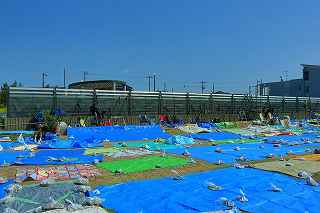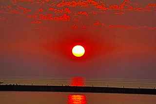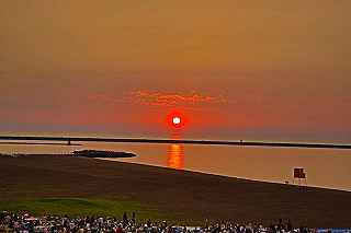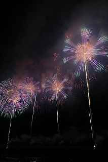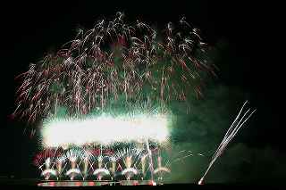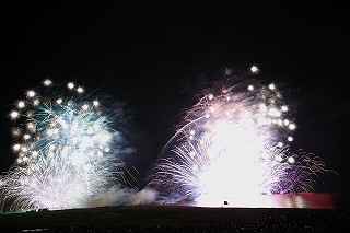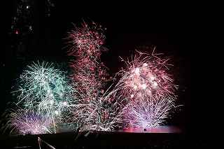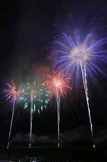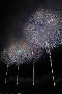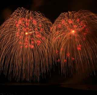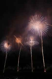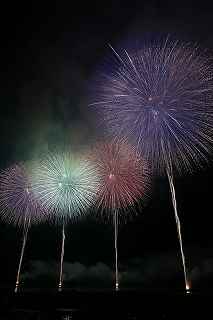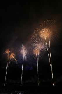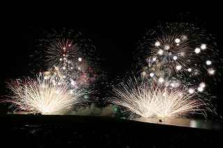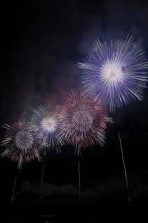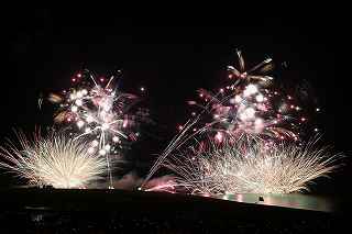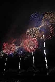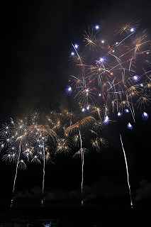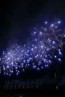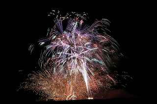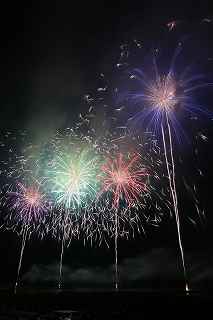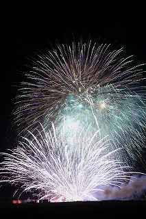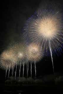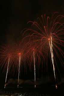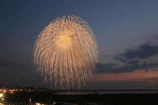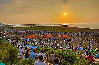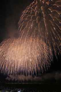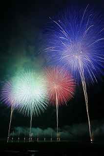 | 今年で3回目の柏崎になる。(公開は初) 逗子、蒲郡、鎌倉と海の花火が続く。 とかく海の花火は風向き、湿気、そして梅雨明けが遅れたりして、しとしと雨や、下手をすると梅雨末期の集中豪雨に見舞われ、土砂災害や洪水被害に犠牲者まで出てしまう。 各地を回っていると必ず、被害があった地域の花火大会では、プログラムには無い鎮魂の花火が揚がる。 今回もそうであった。 本来の花火である。 2006年7月、花火師匠のT氏の勧めで、EOS20Dを携えた新米カメラマンが、柏崎の浜辺に立った。 何処で撮ればいいのかもはっきりしないので、T氏を捜すことにした。 向こうから私を見つけて声を掛けてくれ、「いい場所とったじゃないですか!」と声を掛けられた。 しかしT氏は、その周りを何人かの仲間に囲まれていて、やがて皆とどこかへ消えてしまい、それ以上行動を共にすることは出来なかった。 朝6時の到着、知り合いもいないし、全く未知の場所ゆえ、何処に何があってどうすれば12時間を無駄に過ごすか見当もつかなかった。 仕方なく、工業高校に止めた車の中で寝たり起きたり。 花火大会って、こんなに大変で時間が無駄で、楽しくないものだとは思わなかった。 正直この分野はやめようかな?と当時思ったほどだ。 勿論当日どのような写真が撮れたか記憶が定かではないが、1,5キロ尺玉100発一斉打ちだけは、初めてにしては、まずまずだった記憶がある。 今思えば、柏崎花火の難易度は低くないので、全体的にはたいした物は撮れていないであろうと言う推測が容易に出来る。 それから4年、柏崎は天候に恵まれなかったり予定が合わなかったりで、遠い存在になっていた。 伊勢原のK氏が、何かの話の中で、柏崎は行ったことが無いと言うので、割り勘の相手が見つかったことをいいことに出掛けることにした。 しかし、その年も天候はあまりよくなく、湿気たっぷりの日本海花火だった。 砂山の上で撮影していたので湿気と同時に砂が三脚にベッタリくっ付き、三脚の脚を縮めるのに丁寧に砂を落とさなければならなかった。 打ち上げ中に帰宅するおばちゃんが、砂に脚を取られて手すり代わりに三脚をつかまれたのもここだ。 この時も、柏崎の海辺を広範囲に使った大規模打ち揚げに、カメラを振り回されっぱなしで、満足の行く撮影となったとはいいにくい結果だった記憶がある。 毎年7月26日固定の此の大会は、今年は土曜日とぶつかり、いつも以上の混雑が予想された。 蒲郡で色々話をした中で、W氏がぽつんと「今年は、おいでんと柏崎が重ならないので、両方行くつもりです。」と話してくれた。 「自分も柏崎は行きますよ。」と答えると、行く相手が見つかったとばかりに笑顔を見せてくれた。 彼は前日の午前9時に藤沢を出発し場所取りをしてくれると言うので、何箇所かの撮影ポイントを話しておいた。 自分は当日の午前4時に伊勢原のK氏宅に迎えに行き、圏央道を走り、午前8時にアクアパーク駐車場に到着。 W氏と連絡を取り、すぐに場所確認に行く。 そこは、4年前撮影した場所より150メートルくらいシーユース雷音(ライオン)寄りで、土曜日の熾烈な場所取りを考えれば、申し分ない確保であった。 少しの間、話をして、W氏は,長岡にとってあった宿のチェックアウトに向かった。 さあこれから10時間、K氏と情報交換や、世間話、お昼寝のお時間もたっぷりある、長ーい一日が始まる。 それにしても暑い。関越トンネルを抜けた途端に、文句なしの快晴。 とても8時前の陽射しではなかった。 駐車場についた時には、もう昼ごろじゃあないか?と思える気温.と青空。 W氏が隣の長岡で見た温度計では、昼前には既に37度だったそうだ。 花火写真愛好家の皆さんも、三脚を立てたまま、どこかへ雲隠れし、誰にも会わない。 さしずめ、美味しい、すし屋さんとか、、地元の魚料理店でマッタリし、温泉三昧が定番コースと言ったところか? 自分達も出来るなら、ファミレスに入り浸り、涼しいところでのんびりしたいところだが、柏崎にはそういった類のチェーン店が殆ど見当たらない。 本当に無いのか、新しく出来たところはないのか? 駅くらいまでなら歩いても良かったのだが、此の強い太陽の下で歩くのは、熱中症になりかねない。 消極的に体力温存作戦を取った。 いつもなら天気や風向きを心配するのだが、これだけの快晴では昼に海風、夜は陸風と教える理科の教科書通りである事を疑わなかった。 花火に関しては、間違い無く凄いのだから、後は自分の腕だけだ。 夕方になり、正面に願っても現れないほどの夕日が落ち始める。 一度花火用に完璧にセットしたカメラをいじるのは失敗の元と知りながら、バルブF11を解除し、プログラムオートに切り替え、望遠レンズを装着しなおし撮影してしまった。 撮影しなければ、いられない美しさ、、黙って沈むのを見ていてはいけない衝動、湘南海岸にいるような、それでいて矢張り日本海のど真ん中に沈むのだから、もしもここが太平洋