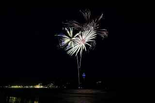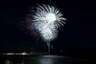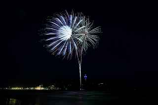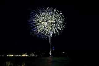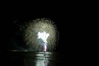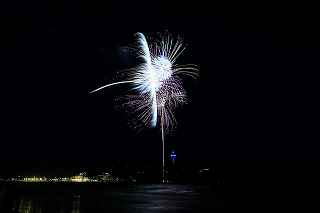 江の水前だと、殆ど灯台にかぶる位置で打ちあがってしまったのだ。(花火の難しいのは、打ち上げ場所=画郭の中央設定と玉の号数=高さの目算、打ち上げ場所までの距離を考えてのレンズの使い分けで、特に小規模な花火では(3000発くらいまでかな)一台のカメラに集中して、縦位置、横位置を変えた方が大抵は成功率は高い。