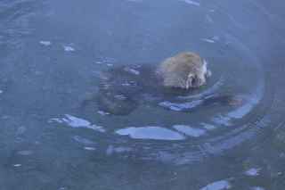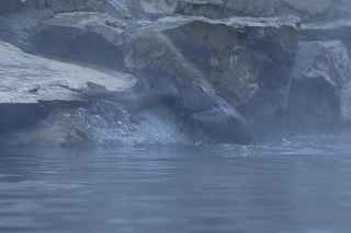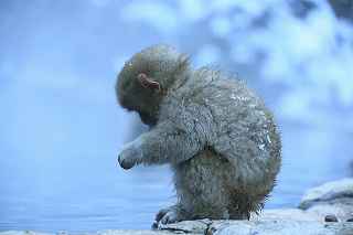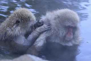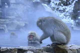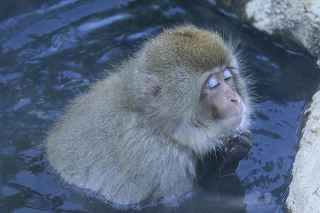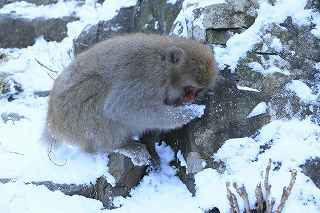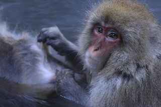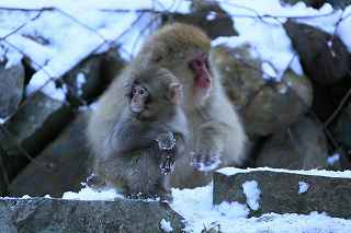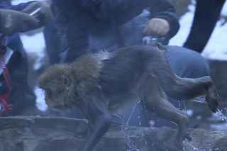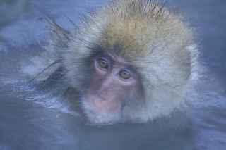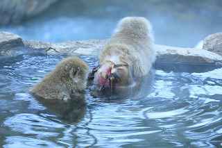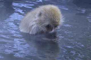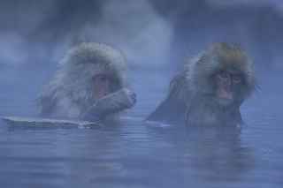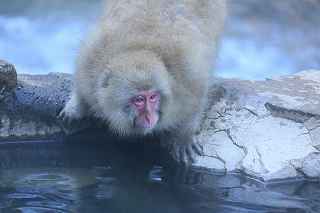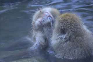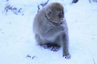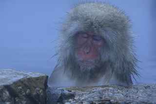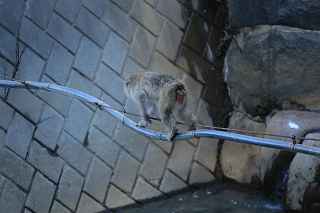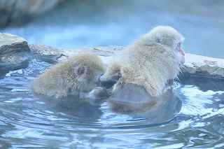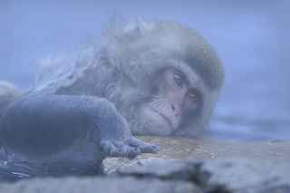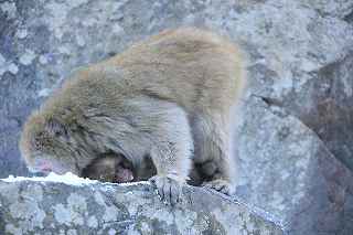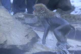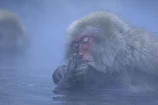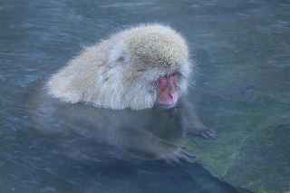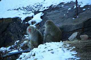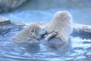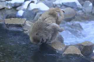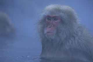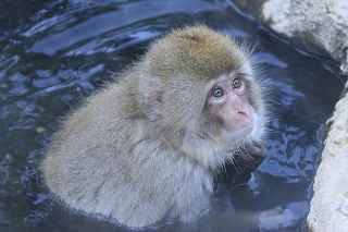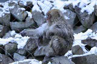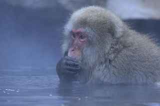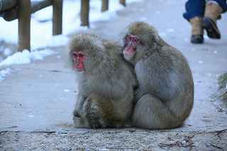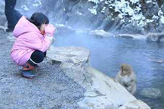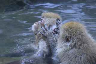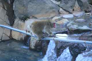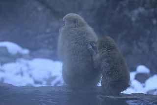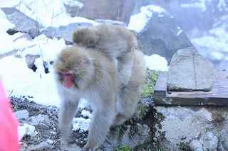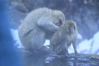 | 「世界で唯一、温泉に入るサル」と言うキャッチフレーズで、一躍有名になったお猿さんたちに会いに行ってきました。 上信越道信州中野ICからR292を15分くらい走り、湯田中温泉の先、上林温泉を左に入ったところに世界的にも有名になったお猿さんは生息。 もっと解り易く言ってしまえば、志賀高原スキー場を目指せば、その手前。 新しい、ブリザック(BSのスタッドレスタイヤ)に履き替えた事もあって、雪よ降れ! そして、雪景色の中のいわゆる「スノーモンキー」を期待したのですが、こういう時に限って天気は晴れ。 それでも標高600メートルほどの谷あいは、朝は氷点下、昼頃でも4〜5度くらいしかなく、高い山に囲まれている為、日差しが差し込むこともなかった。 日曜日で駐車スペースが心配だったので8時着、場内はアイスバーン状態。 駐車場からは30分は歩くというので、8時15分出発、1,6キロのハイキング? 最初20段チョッとの登り階段、だが初めての場所故この階段がどこまで続くか判らず、嫌な予感。 甲府の八王子山の二の舞かと、かなりのトラウマ。 幸いにも、その後は嘘のような平坦路。 しかし、未舗装の石が突き出すデコボコ道は凍結し滑る。 道幅は軽自動車がギリギリ通れる程で、混雑時にはカップル同士が、お手手繋いで寄り添ってすれ違える、いい感じの幅? 両側の斜面には、しっかり雪は残っているものの、この時期としてはとても積雪は少ないそうだ。 地獄谷温泉「後楽館」の建物が見える頃、「何だ、楽勝ジャン、30分もかかんないジャン!」と思った途端、右手に急な階段が現れ、しっかり野猿公園の矢印がある。 かなり急な階段を息を切らせて登ると、その後はコンクリートの舗装路。 しかし、ここで早くも横湯川を挟んで対岸同士のサルがバトルを始めた。 こちら側の三匹の群れのうちの一匹が、太い電線のようなものを伝わって対岸へ行こうとすると、対岸からサルが一匹、猛スピードで現われ、電線を渡りながらあたりに響く声で威嚇する。 ほぼ中央で、睨み合いと鳴き声による脅しが数秒続いた後、手前のサルは、お尻を向けてこちらの岸へ。 急いでカメラを取り出し撮影するも、睨み合いの様子は撮り損なってしまいました。 このシーンを見て縄張りが有るのかな?と直感、負けたサルは、他の仲間とどこかへ消えてしまいました。 左手に流れる横湯側の河原には沢山のサルがいて、全くこちらを気にする事もなく走り回っていました。 そして幅一メートルほどの舗装路の先には、道を塞ぐサルが二匹・・・。 何人かの見物客が、ここで立ち往生。 ここではいつの間にかサルのほうが偉くなっていました。 やがて、一人の「人間」が、すり抜けるようにサルの横を通ったのですがが、サルは全く無視。 退きもしないし、警戒して威嚇する事もしない。 後から来た「人間」も、その隙間をそうっと抜けた。 このことは、ここでの人間とサルとの関係を学ぶには好材料で、お互い無関係でいることがお互いにとって一番良いことなのだと痛感した次第。 入苑料は大人500円、大きな禁止事項は、えさやり禁止、目を合わさない、自撮り棒使用撮影不可、などだが三脚は認められている。 しかし、横6〜7メートル、奥行きにして3メートルほどの「サル専用温泉」に、周りの見学スペースは極めて狭い。 実際には楕円形だが四角形に例えれば4辺のうち2辺しか見学場所はない。 そんなところに三脚など立てていたらブーイングもの。 実際多くの観光客に混じってカメラマンも多かったが、彼らは殆ど三脚は持参していないか、持参してもただの「お荷物」でしかなかった。 たとえ、三脚を使用したとしても、サルの動きが早く、一箇所でのんびり湯船に浸かっていればいいけれど、所詮相手は動物、動きすら予測できない。 多少感度を上げてでもシャッタースピードを稼ぎ、手持で撮影しなければ、サルの表情はゲットできない。 訪れたカメラマンたちのレンズだけは凄い望遠レンズが目立ち、28〜300ミリの自分も圧倒された。 実は、この日に限って言えば、おサルさんたちは一度に10頭温泉に入ることはなかった。 よって、広角では温泉に入るサルの数が少ない分、寂しい写真にしかならなかった。 フルサイズで300ミリもあれば十分だろうけれど、荷物を軽くする為24〜105ミリにしようか迷ったのだが、実は300ミリでも多少不満が残った。 そこで、サブのAPS-Cに換装、480ミリとした。 サルの顔を画郭一杯で撮りたければ、これくらいあったほうがいいです。 と言うのも、サルが温泉に入ると、みんなカメラを持って一箇所に集中し、体を乗り出して撮影するのが常なので、その塊の中に入れなかった場合など、多少遠くからでも、引いて撮影できるので、かえって全体が見渡せてメリットがあります。 何度も来る事ができればサルの顔も色々違っていて、「オー又会ったなあ」などと明確に区別できる差が有るので別な楽しみもありますが、次回は絶対雪の降るシーンが撮りたい。