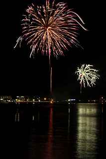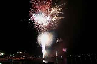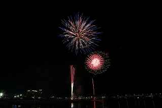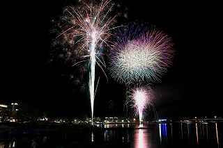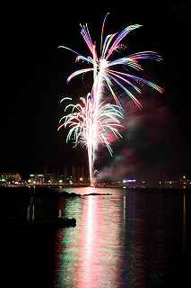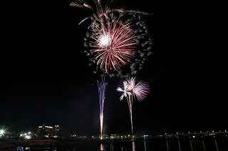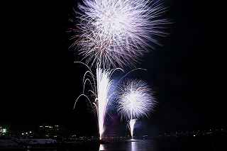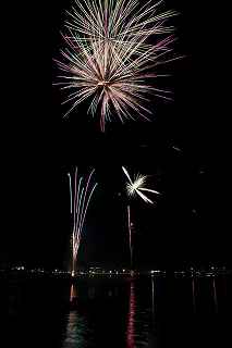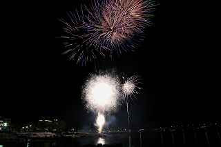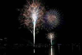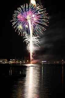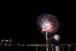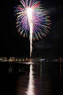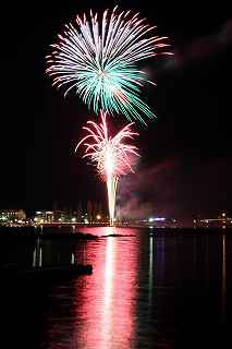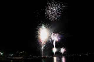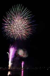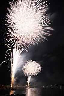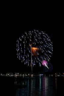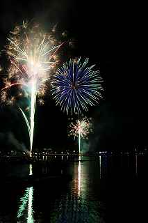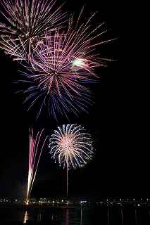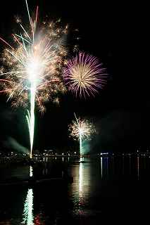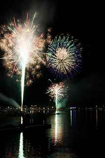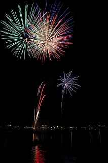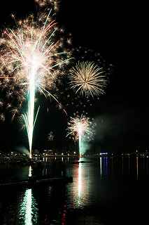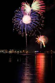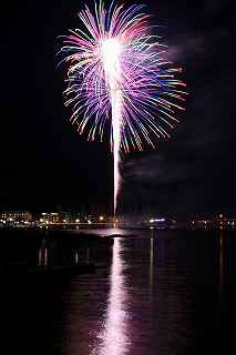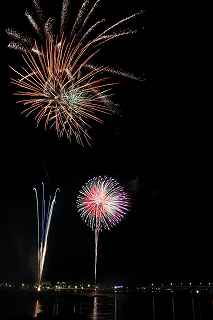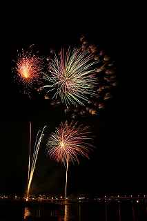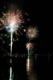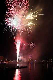 | 河口湖の冬花火は3箇所から打ち上がる。 今回の撮影ポイントから順に、畳岩、メイン会場の大池公園、そして河口湖大橋の向こう側に位置する八木崎公園の3箇所。 知り合いのカメラマンは、この3箇所の花火が一つの画郭に収まる場所から撮影する、大変高度な試みをしている。 もっとも、花火鑑賞士という資格を持ち、花火の殆ど全てを知り尽くしており、又此処の花火を担当する斎木煙火本店さんを研究されておられるので、こうした撮影が上手く出来るのだろう。 8日は午後3時ごろになり、ようやく雨も止み、西の空が明るくなってきた。 これから西高東低の冬型が強まり、気温が急速に下がり出すと、河口湖にも霧が発生してしまうかもしれない。 しかし、どうも回復がゆっくりで、気温もそれ程下がってこないし、北風もそれ程でもない。 富士山は諦めるにしても、近場で、花火だけ撮る事は可能ではないかと判断し、駄目もとで出発。 靄っていれば、大池公園で間近かの花火を撮るのも良し、それなりの視界なら、3カ所遠近狙いを試そうかと考えながら、箱根を過ぎ乙女トンネルを抜ける。 富士山は、頂上に雲がかかっていたが、思いのほか見える。 山中湖湖畔では、その姿は、はっきり暗闇に浮かび、3カ所狙いに気持ちが傾いた。 山梨県でも、午前中まで降ったのは、雪ではなく雨だったようで、路はかえって綺麗に掃除された感じで走りやすかった。 帰りの凍結も心配だったが、早々と融雪剤を撒く黄色い作業車とすれ違う。 河口湖の駐車場も雪はすっかり湖畔に片付けられてはいたが、水溜りは、既に氷が張っていて、小さな子供が頭からきれいに後方へひっくり返ったりしていた。 大人だったら、かなり危険な転び方なのに、5,60センチの幼児の重心の低さにはびっくり、さっと立ち上がって、何事もなかったように歩き出した。 3カ所打ちの撮影ポイントは、大方の予想はしてきたものの、矢張り現場に着くと微妙に迷う。 この辺かなと思う場所は、雪が積み上げられていたり、少し下がった場所では、「船着場の明かりが点き放しだよ。」と船員に教えられた。 どうせ初めての場所からの撮影だし、筒が見えるわけでもないから、適当に雪を掻き分けて三脚を立てる。 結果、場所の問題はドンピシャ当りだった。 しかし、3箇所からの同時打ちではないので、時間差のある花火をどうやって三つ入れるかが結構難しい。 それと、レンズも24〜105ミリ縦位置で正解だったのだが、、畳岩での打ち上げ花火を出来るだけフレーム一杯にしないと、八木崎公園の花火は町の灯りと間違えられそうなくらい小さい。 結局、3箇所一緒に撮る事が出来たのは、たったの1枚だけ、それも露出オーバー。 殆どは、二箇所を捉えるので精一杯なものばかり。 絞り、露光に気をつけて、又のリベンジと成ってしまった。 自分の未熟さと、花火撮影の奥の深さを感じつつ、又一つ面白いチャレンジが出来る喜びを感じながら、融雪剤の撒かれた国道を、それ程気を遣うことなく走り、帰路に着いた。 撮影日:2015−2−8 20時00分〜20時20分 河口湖町船津にて |