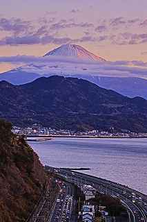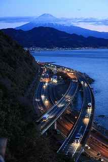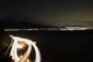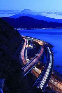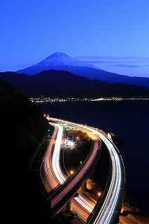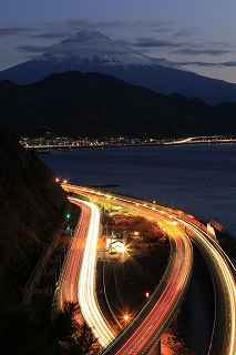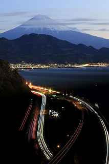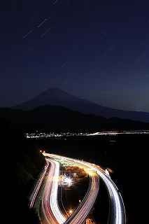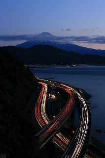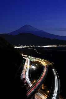 | 近ちゃんギャラリーのコーナーの一つに「夜景と光跡」があり、自分の写真も僅かながらアップされています。 現在師匠は、お仕事の関係で、丸一日フリーに使える時間がなく、どうしても撮影はお昼過ぎからとなってしまいます。 しかしながら、そこはさすが師匠、夜景やイルミに重点を置いた精力的撮影に特化していらしゃいます。 自分もこの分野に関連する被写体には、多少立ち入っていて、何件かは追いかけてはいるものの近藤師匠の幅広いフィールドには、ただ舌を巻くばかりです。 静岡県にある「さった峠」は、本来なら富士山を眺める(撮影する)ために、早朝から午前中に出かけて雄大な風景をカメラに収めるのが常套手段ですが、それは既に2013年4月の相棒の栞で掲載してありますから、そちらをご覧下さい。 今回は、師匠の「光跡=高速道路」のジャンルに相応しい様に、未明から日の出直前にかけて「さった峠」からの車の光跡をカメラに収めて来ました。 この場所を選択した理由は言うまでもなく光跡がクロスラインする面白さからです。 正確には東名高速だけでなく、国道一号線バイパスを走る車、在来線の東海道本線の電車の光跡まで写すことが可能ですが、タイミング的には電車はなかなか走ってくれません。 未明はJR貨物が頻繁に通るのですが、光跡には少し明るさが足ならないのが悔しいところ。 時間の経過で周囲の明るさが変化する以外、同じ場所からの撮影ですから、いくらクロスラインが面白いと言えども単調で変化に欠けます。 富士山の雲海なら、自然が相手ですから予測がつかない動きをしてくれ感動も有りますが、高速道路上の車の光跡は、台数が多いか少ないか程度の差しかありませんから、高が知れてます。 そこで、矢張りどうしても富士山のシルエットだけは入れて、何とかレベルアップを図りました。 そうしないと、わざわざ、そして、はるばる静岡県由比町まで来た甲斐がありませんし、どこで撮ったのか判らない写真になる事だけは絶対に避けたいですから。 尚、車の台数を多くし、光の帯を豊富にした写真なら単に長く露光しておけばいいのですが、それでは明暗差が余りにも大きく、富士山が完全に負けてしまい存在感がなくなってしまうので、車の光跡は極力絞りました。 そのため現場での撮影時に少し手間のかかる作業をしましたので、僅かな枚数しかアップできませんが、PC処理をしない(出来ない)自分にとってはこれが精一杯かもしれません。 撮影日:2016−1−21 静岡県静岡市清水区にて |