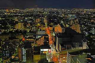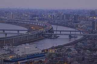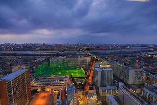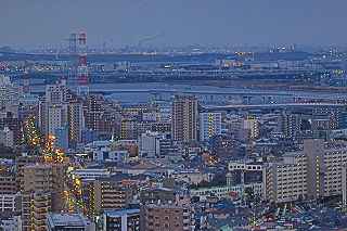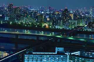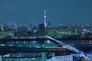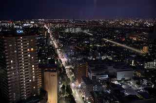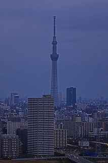 | この日は15時くらいまで良く晴れていたのですが、次第に曇り空に変わり首都高湾岸線を走っている頃には、北東に黒い雲まで出てきて予報通りの下り坂。 またしても遠望冨士は期待できず、テンションが下がり気味で都営新宿線船堀駅前を目指す。 近藤師匠の精力的夜景撮影も、「呑み屋街」から「歓楽街」、究極とも言える「墓地」まで行き着き、題材選びには事欠かないご様子。 その中でも、市川の「アイ・リンクタウン」の作品は、たっぷり富士山を撮影され、また素晴しい夜景に、是非自分も(無料と聞いて)行ってみたくなりました。 それは又別の機会にするとして、同様に無料で結構いい夜景観賞が出来るタワーとして、江戸川区の施設である、「タワーホール船堀」に出かけることにしました。 駅至近なので、車でのアプローチの必要性は殆どありませんが、機材の事を考えれば駅前の交通混雑も我慢しなければなりません。 平成11年に完成した江戸川区の「区民会館を相当ボリュームアップした施設」は、イベント会場、コンサート会場結婚式場は当たり前、映画館まであり、更に115メートルに達するタワーですから凄いです。 しかも無料、500円から800円の価値はあると見ました。 確かに高さは、ランドマークタワーや世界貿易センターより低いですが、荒川の近くにあるため、周囲にそれ程高層の建物がない分、見通しが利くのです。 ここの売りはスカイツリーに近い事、近いといってもスカイツリーに近すぎても撮影は空を見上げてしまうので、そういう意味で撮影しやすい近さの距離なのです。 ですから頑張って、スカイツリーを中心に狙ったのですが、何枚も失敗しました。 初めての場所故、矢張り知らないことや勘違いはつき物。 先ず7階まで普通の来館者と同じようにエレベーターで上がります。 展望台にはトイレはありませんとの案内を見て、まずトイレへ行き、右方向へ廊下を歩くと50メートル程先にエレベーターガールが待っています。 「いらっしゃいませ。三脚ご使用ですか?」と尋ねられる。 「最上階の展望室は、三脚禁止となっております。下の階でならお使いいただけます。」 江戸川区の建物ゆえ、公務員かどうかわからなかったが、浜松町のどっかの展望台の説明より全然丁寧だった。 「判りました、手持ならいいんですか?」 「ハイ」 それからエレベーターに乗り込む。 上がっていく最中は、お決まりの案内をしてくれるのだが、自分ひとりしか乗っていないので、いつの間にか、「ウン」とか「フーン」とか言っていたかも知れない。 ここから問題発生。 降ろされた階が最上階なのかその下なのか判らなかった。 初め、少し明るかったので手持で撮影していたのだが、撮影に熱中してしまい、三脚可能な階なのか否かを確認することなく、三脚の上にカメラを載せて撮影し始めていた。 自分のいる階が把握できていなかったのが、ご注意を受ける発端となった。 少し後から、同じく三脚を使用して撮影を始めたYさん(後で自己紹介を受けた)と二人、エレベーターガールから下の階に降りるように案内された。 「案内された」と記し、「言われた」と表記しなかったニュアンスをご理解ください。 それは非常に丁寧に、案内されたから。 完全に自分の思い込みだった事を、女性に伝え、一つ下の階に下ろしてもらった。 実は最上階には、それなりに家族連れを中心に来館者がいて、子供が三脚に脚を引っ掛ける可能性はあったのです。 こちらとしても、集中して撮影するにはイマイチ周りが気になっていました。 一つ下の階に降りると、そこは全く同じつくりをしていて、殆ど最上階と区別が付かない空間でした。 最初に違いとして発見したのは、折りたたみのパイプ椅子が上には3つあったのに、ここは2つだったというくらい。 そして、最大の違いは、自分とYさん以外誰もいなかったという事。 時折(一時間に一回くらい)警備員の方が見回りに来ますが、それ以外は南と西方向に離れていても二人で会話をしながらの撮影が可能。 おかげで相当集中して事に当たれました。 しかし、出来ればもう少し照明を落としてくれれば、より内部の写りを気にしないで撮影出来たのですが。 屋外での撮影の場合、強風によるブレが心配で、これは風が止んでくれるのを、あるいは少し弱まるのを待てばクリアーできなくもありませんが、ヤビツ峠の様に、木造展望台の上ですと、矢張りブレは気をつけていても人が階段を上がって来れば、防ぎようがなく、帰宅後「やっぱりダメだな」の世界に陥ります。 屋内展望室の場合は最新の注意を払えば、微妙な角度で室内の反射を抑える事ができます。 しかし、上手く行ったと思っても、隅の方に、薄ぼんやりと室内の灯りの反射が写っていたりしますので、矢張り基本は沢山撮っておくことでしょうか? Y氏は関西から、写真コンクールに入賞したその授賞式に出席する為、東京までいらしたそうで、話をしている内に被写体へ知識欲、