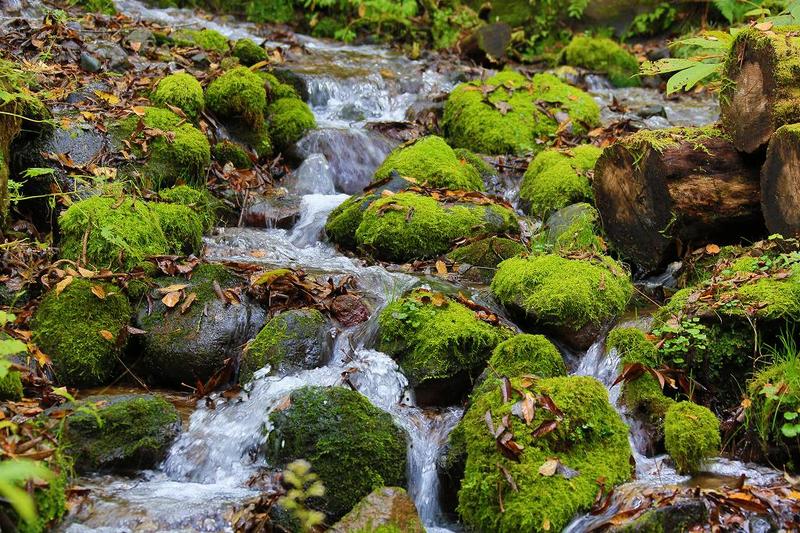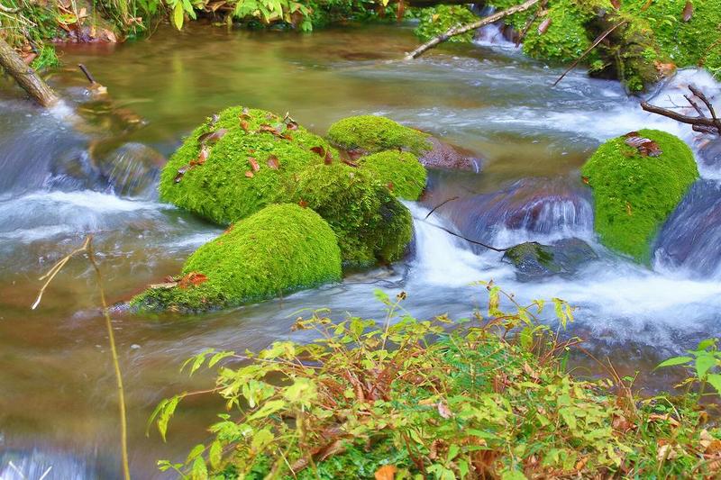 原生林に囲まれた「尚仁沢湧水」の起点まで行くには、それなりの覚悟が必要。ゆっくり歩いても30分ほどだと言う案内はあっても、途中の景色がすばらしければ、倍の時間を見ておく必要がある。遅くても12時にはここを出発して帰らなくてはならないからだ。しかし、それは「杞憂」に過ぎなかった。撮影するに値する被写体がほとんど無いのだ。ただ、とんでもない上り階段と、それに続く鉄製の下り急階段、そこから先は尚仁川に沿って、ピンクのリボンを目印に歩くだけ。目的地までの距離案内は有難いけれど、後600メートル、後400メートルとか表示されていなかったら、途中で引き返したくなる道の悪さと、眺めの平凡さ。帰り道、終点の湧水に向かって歩いてきたカメラマンと出会い、立ち話をした。彼が尋ねるには、「この先、紅葉しているか」ということと「絵になる場所があるか」と言う点。奇しくも彼の口から出た言葉が、「途中あまりに紅葉していなくて、引き返そうかと思った。」との言葉。「せっかくここまで来られたのだから、あと400メートルくらいですから行ってみて下さい。」と、なだめる自分。紅葉は期待できないと、モニターを見せながらの説明。まあ、それほどカメラマンの望む景色には、応えてはくれないハイキングコース。