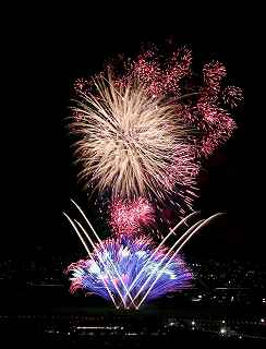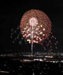花火写真の師匠であるT氏が私に、近くで一番いい花火の一つに「山梨県の市川大門の神明の花火大会」を教えてくれた。 撮影日:2012−8−7 19:30〜21:00 |