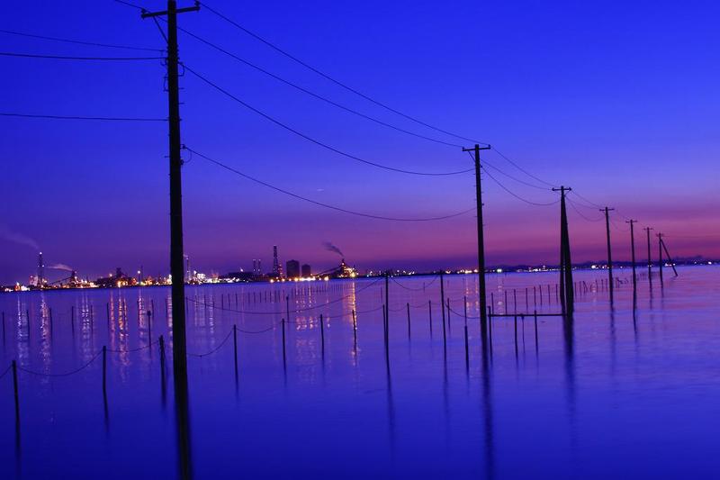 「隣、お邪魔します。」礼儀正しく挨拶をしてくださった6D・/MarkUのカメラマンさんは、不案内な土地での素晴しい案内役となっていただいた。残念ながら、お名前まではお聞きする事はできなかったが、「地元」の方らしい。その方のお話を伺っているうち、ここが「江川海岸」ではなく、「久津間海岸」であることを知った。「あっち(江川海岸)には10名ほど見えますねー」と。通りで空いていると思った。「自分は、こっちの方が好きですけれど。電柱が沖合いで曲がっているのがいい。工場をバックにするならあっちですがね。それにしても今日はいいほうですよ。」初めはそう言っていた彼も、日が沈み、夕景になる頃になると、「こんなに綺麗な夕日は滅多に無いですよ」とグレードアップ。何度も足を運ばれているカメラマンの重みのある言葉だった。風はそれ程強くは無くむしろ予想に反して弱目だった。湘南海岸での夕景は腐るほど撮っているが、本当に綺麗なそれは確率的には低い。千葉県にまで来て、夕景を撮るのは記憶の限りでは2回目だが、結構ラッキーだった。日が沈んだ後の空の色も抜群に感動モノで、それを写真の色として出せるほどのカメラ技量が無いのが残念至極。