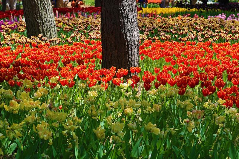 昼近くに「みはらし・エリア」=(ネモフィラ)を後にし、西駐車場方面へ。この時間、帰る人より来る人のほうが圧倒的に多く道一杯の混雑。何度もぶつかりそうになった。「たまごの森チューリップ・ガーデン」のそれは(後半の)見ごろと言うことだったが、こちらは本当に今日から明日位までが見頃ではないかと思える咲きっぷりだった(ネモフィラは個人的にはもう少し先じゃないかと感じた)。ただ、花壇の周りに群がる人は凄く、前の人が退くのを待っていたりするほど悠長な人口密度ではない。空いている場所からスナップ写真を撮るのがせいぜい。「昭和記念公園」のチューリップガーデンは非常に素晴しく、完全に設計された配置にチューリップを植え、今流で言えば「インスタ栄え」は最高だ。それに比べれば見劣りするものの、あちら(昭和)を知らない人にとっては、これで十分満足できる。「ネモフィラ」のスケールは昭和記念公園を圧倒しているのだから、チューリップの方はあちらに「花」を持たせてあげれば、バランス的に丸く収まるというもの。
