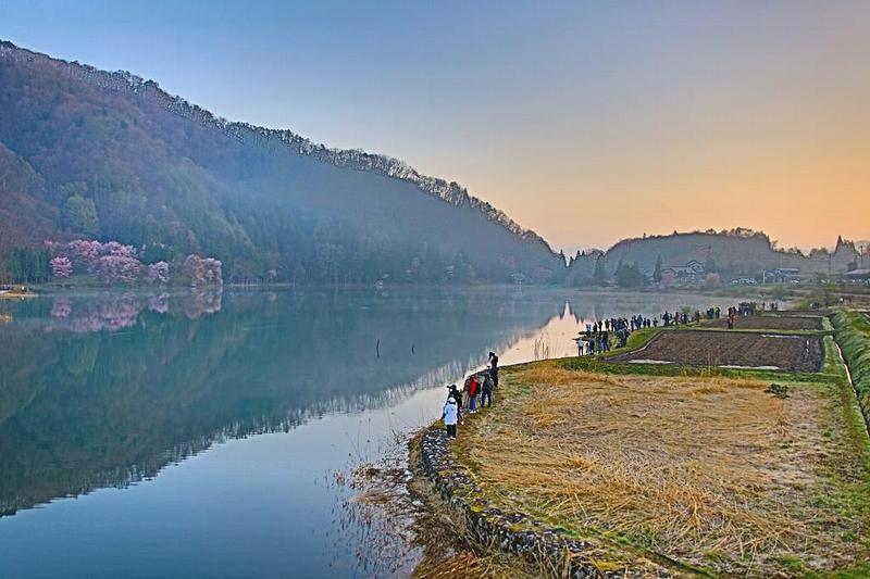 今回は、急に満開だということが判り、急いで出かけることになったが、右も左も判らなかった「亀岩の洞窟」のハートマークの撮影の時と同じように、場所取りに不安を抱いて撮影に臨んだ。しかし、「中綱湖」のオオヤマザクラの撮影場所は、いくらでもあるというのが、行ってみて判った。更に、朝日が当たり始めてからは、三脚にしがみつかなくても、激戦ポイントに手持ちで乗り込んで行き、隙間からでも十分撮影可能。皆撮影に夢中なので、横一線を守れば文句は言われない。実際、自分も日が昇ってからは、荷物を置いて「オオヤマザクラ」の近くの激戦区に遠征した。ジックリ構えることは出来ないが、色々な場所から撮りたければそう言う作戦も有りです。「亀岩の洞窟」では、キッチリ「ハート型」を捉えるのには、緩めに見ても5〜8人程度の狭い場所しかポイントが無い。それに比べれば、「中綱湖」は、どこでも撮影できるといっても良いくらい。「100人や150人(もっとか?)、どうぞいらっしゃい!」位のエリアが広がっている。満開の時期さえ逃さなければ、そして風さえなければ、誰もが素晴しいシンメトリーが撮影可能だ。 |