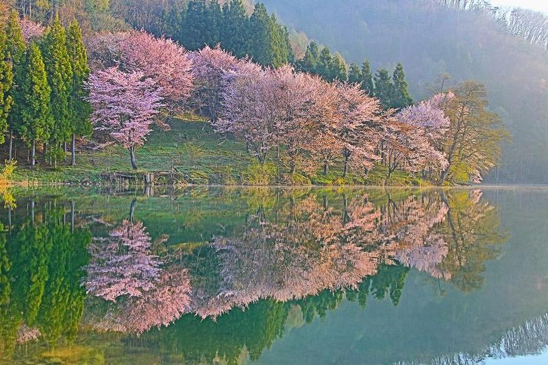 試し撮りも含めて、4時頃からシャッターを切り始めたが、どうも長めの露光をしてもはっきり写らない。やがて、山の輪郭が微かに判るようになったころ、湖全体が靄っている事が判った。ここは標高800メートル程有り、勿論気温は一桁台。防寒用のコートを着ていても、寒くないといったらウソになる。一筋の雲(朝霧?)が山の中腹から湖面に降りて来て、辺りは一層幻想的になった。周辺には50人ほどカメラマンがいる筈なのだが、静かだ。シャッター音だけが不規則な間隔で聞こえるだけ。空は早めに明るくはなったが、太陽が差すには未だ時間がかかる。よって、さくらの発色はまだまだ。カメラの露出を変えても色は出ない。やがて、後方の山から太陽が差し込むと、それは、かなり紅が強いピンク色の「オオヤマザクラ」が現われた。背景の木々のグリーとのコントラストも綺麗だった。そして、湖面への写りは目を見張る美しさがあった。暫しシャッターを押すのを忘れて、唖然としていたのだろうか?帰宅後、朝日が当たり出した、その瞬間が数分飛んでいて、撮影出来ていなかった。風は殆ど無かったが、それでも湖面へ詳細なさくらの映りはイマイチだったのが残念。別な場所で、撮影すれば、もっと良く映る場所があるのではないかとも思ったが、欲の掻き過ぎかも知れない。
