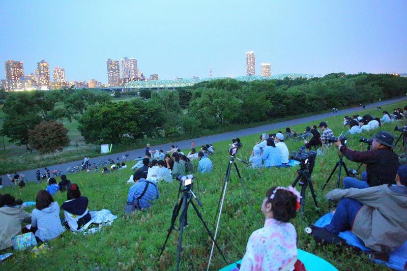土曜日と言うことで、所要約90分とナビには出ていたが、2時間はかかるだろうと思い14時半出発。到着は16時半過ぎ。途中、首都高の降り口を間違えたり、都内の道はややっこしい。そもそも、北区と言う区には行った事がない。到着後、手ぶらで土手に上がると、土手道路沿いは、空いているスペースのほうが少ないほど場所取りがしてあり、ビックリ。埼玉県の花火なのに、此れではまるで東京都の荒川花火大会のよう。三脚もチラホラ立ってはいたが、対岸の花火筒は見えず。やむを得ず、対岸に見える有料席の青色エリアの中心まで歩く。風は斜め後ろから吹いているので、なるべくJR宇都宮線・京浜東北線の鉄橋近くまで足を運んだ方が良さそう。と思いながら歩いていると、ヘリポート先で、花火師匠のT氏とばったり出会う。2年ぶりの出会いになる程、ご無沙汰していた。T社長も丁度土手を上がって来られたばかりと見え、これから場所探しのようだった。積る話は山ほど有ったが、とりあえずは場所探しに専念。この土手道路から埼玉方向を見ると、河川敷に時々それなりに高い木が有り、その木が乱立しているところは空いていて、木々が途切れたところには三脚がひしめき合っている状態。それでも座って撮影するカメラマンもいて、土手の傾斜もあるので、二列になっても全く問題なし。