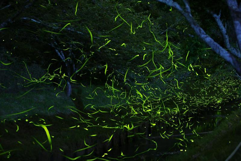 19時半になるとゾクゾクと見学者が訪れ、それなりの人で賑やかになっていった。しかし、流石に平日だけあって、例えば橋の欄干に幾重にも見物客が重なるとか、ロープ伝いに列が作られるとかいった混雑にはならなかった。カメラマンもそれなりには目に付いたが、来訪者の2〜3割くらいが三脚持参のカメラマンと言った所。ガイド係りの人に聞くと20時から20時半までが一番飛ぶと教えてくれたが、ここもやっぱり最初に光出したのは19時40分だった。一頭が光ると連鎖反応で、三頭がシンクロし、やがてパッと飛び立つ。小さなお子さんも多く、「飛んだ!」と大声で叫んだり、「こっちも光った!」と興奮気味に指を差したりする、毎年の光景が繰り返される。