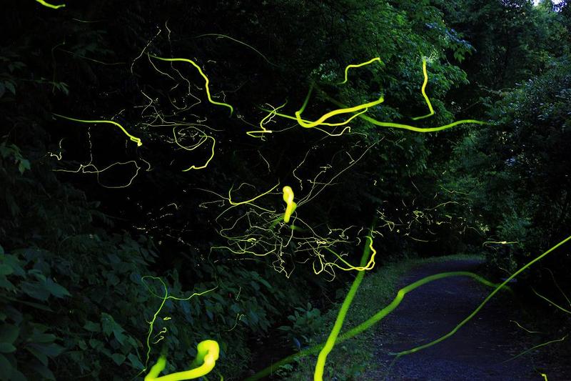 漆窪には今日も誰もいなかった。しかし、ホタルは19時25分には光り始め、15頭ほどが20時前後まで飛んでくれた。だが、20時半になると木に止まったまま、やがて光る事さえしなくなった。今頃引き返してもまだカメラマンも見物客も多いだろうと思い、仕方なくカメラを3分間の開放にしたままタイマー・レリーズで自動撮影。帰り支度をして折りたたみ椅子に腰掛けたり、付近を散歩したりしていた。20時半少し前、鎌倉から山伝いにハイキングに来たという9人グループの集団が、大丸広場から下りて来たのにはびっくりした。流石にこの時は「多勢に無勢」、こちらの方が慌てて撮影を中断した。9個もの光が急階段を下りてくる光景は、こんな山の中では少し異様。少しして氷取沢方面から若い女性3人が、懐中電灯をピカピカさせながら通り過ぎて行く。無人の三脚に驚くでもなく・・・。その後、この場所を諦めて池の下広場へと移動。途中、中年のご夫婦が灯りをつけて上がって来ようとしていた。挨拶を交わすと、「蛍いましたか?」のお尋ね。きっぱり、全く飛んでない事を伝える。「昨年はかなり飛んでいましたけれど・・・。」のお返事。此れも今日の収穫情報。そうなんだ!j時期さえ合えば期待できる事が判った。