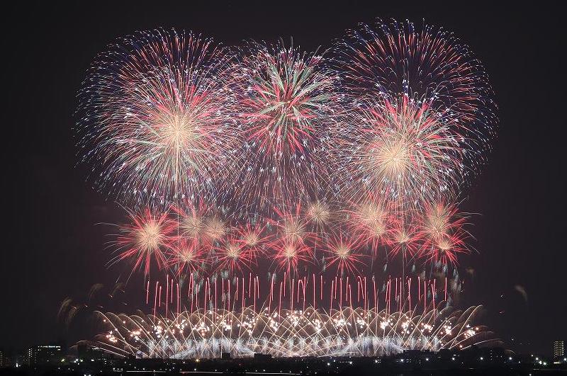 オープニング担当のアルプス煙火工業さんは、安曇野や鴻巣の4尺玉を見させていただいてい居りますが(昨年の全国花火競技会で優勝)、赤川の広大な土地でその実力を最大限に出し切った素晴しいオープニング花火だったと思います。ドラマチック花火を今年も担当した磯谷煙火店さん、今年は「水戸黄門」をテーマにされた型物を沢山打ち上げたらしいですが、8キロも離れていると残念ながら全く蚊帳の外でした。「市民花火」を担当されたのが、紅屋青木煙火店さん。その凄さに、プログラムのど真ん中で最高潮に達した感があります。仙台からのカメラマンさんは、「青木さんって言うから誰だろう?位にしか思っていなかったけれど、こんな凄い花火初めてだわ。」と、感動してました。唯唯、遠すぎたのが残念です。特に赤をふんだんに使った青木さんの花火、雲や靄により反射して残念至極でした。「希望の光」担当の(株)マルゴーさんは、神明の花火のほぼ再現で、ラストのグリーンまで一緒でした。もっともそのグリー色の発色は全く神明とは大違い。白のベールを被っていました。エンディングを飾った伊那火工堀内煙火店さんですが、一段と進化した花火=スターマイン・兆速イルミネーションを披露してくれました。遠くから見たので、返ってそう思えたのかも知れませんが、壁一面が巨大な電光掲示板になり、LEDが忙しく点滅しているようで、その動きの速さといったら、とてもハナビとは思えない初めて味わう感覚でした。今年は秋の藤沢江の島花火が、小田急江の島駅の改修工事で中止になっていて、伊那火工さんの花火が見られず残念です。